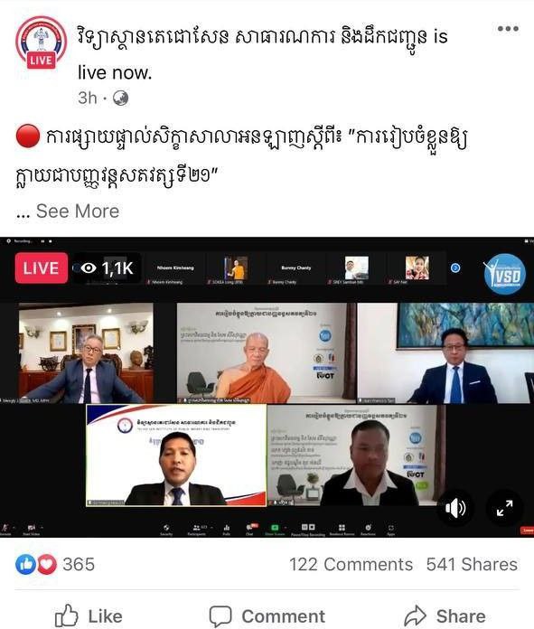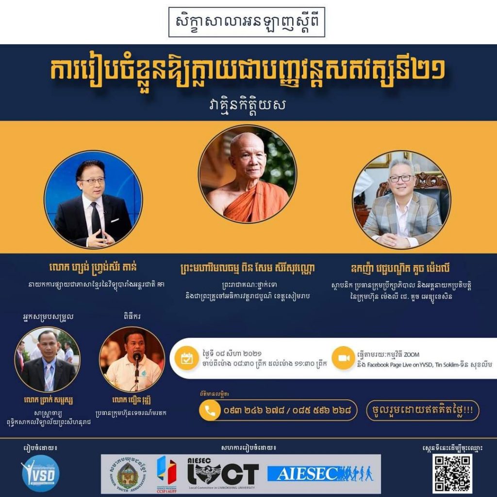 សិក្ខាសាលាអនឡាញ ស្តីពី “ការរៀបចំខ្លួនឱ្យក្លាយជាបញ្ញវន្តសតវត្សទី២១” ដែលរៀបចំឡើងដោយ ក្រុមយុវជនស្ម័គ្រចិត្ត ដើម្បីការអភិវឌ្ឍសង្កម(YVSD) ដឹកនាំដោយលោក ទីន សុខលីម ស្ថាបនិក និងកញ្ញា យ៉ាត សេងហួរ ប្រធានក្រុមយុវជនស្ម័គ្រចិត្ត ដើម្បីអភិវឌ្ឍសង្គម ប្រចាំឆ្នាំ២០២១ ដោយសហការរៀបចំជាមួយ វិទ្យាស្ថានតេជោសែន សាធារណការ និងដឹកជញ្ជូន៕