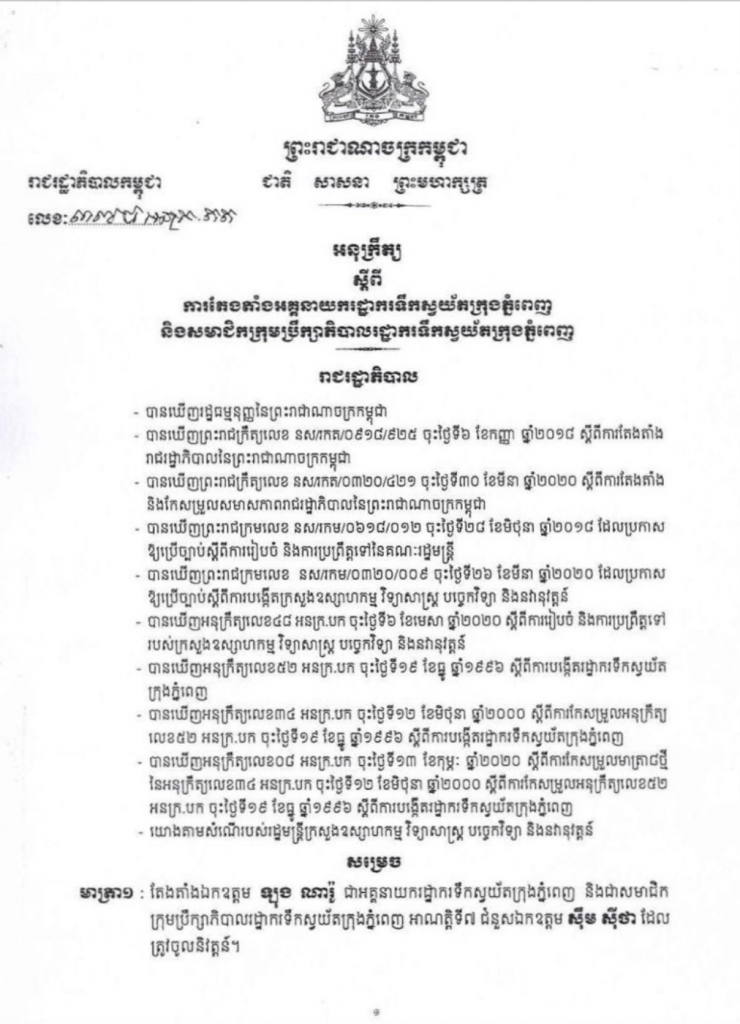 ប្រមុខរាជរដ្ឋាភិបាលកម្ពុជា សម្តេចតេជោ ហ៊ុន សែន សម្រេចចេញអនុក្រឹត្យតែងតាំង លោក ឡុង ណារ៉ូ ជាអគ្គនាយករដ្ឋាករទឹកស្វយ័តក្រុងភ្នំពេញថ្មី ជំនួសលោក ស៊ឹម ស៊ីថា ដែលត្រូវដាក់ឲ្យចូលនិវត្តន៍។