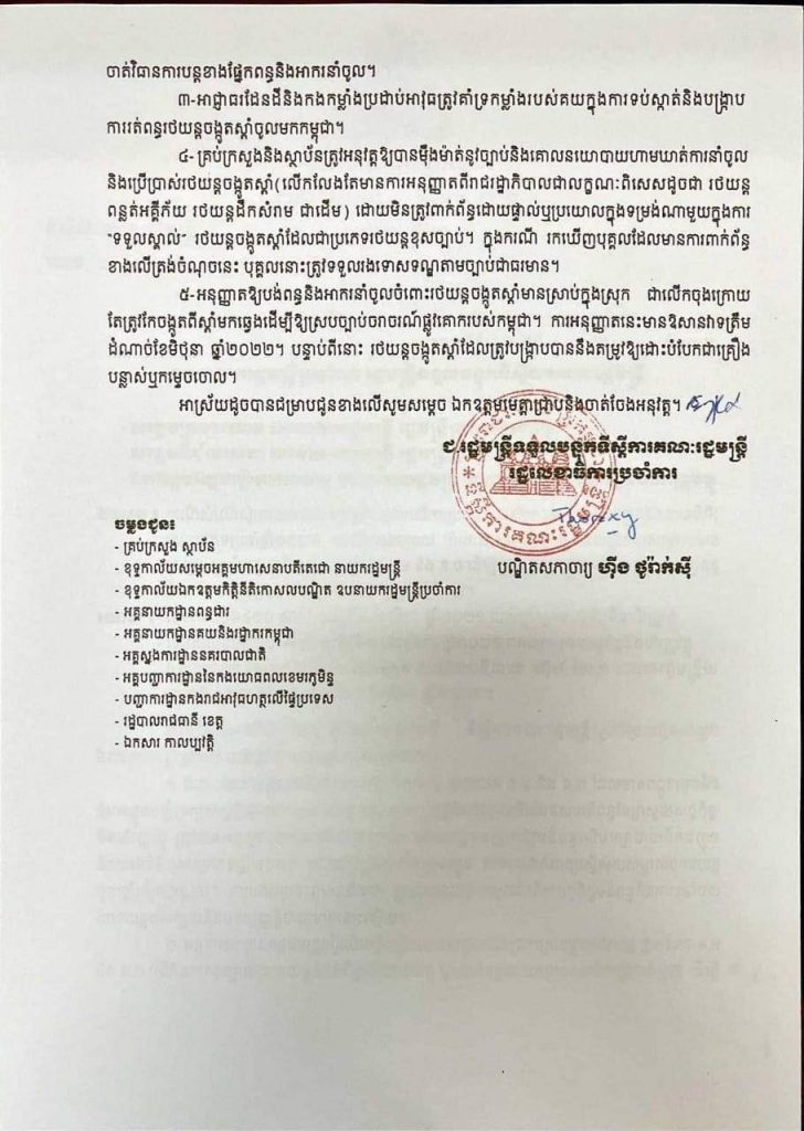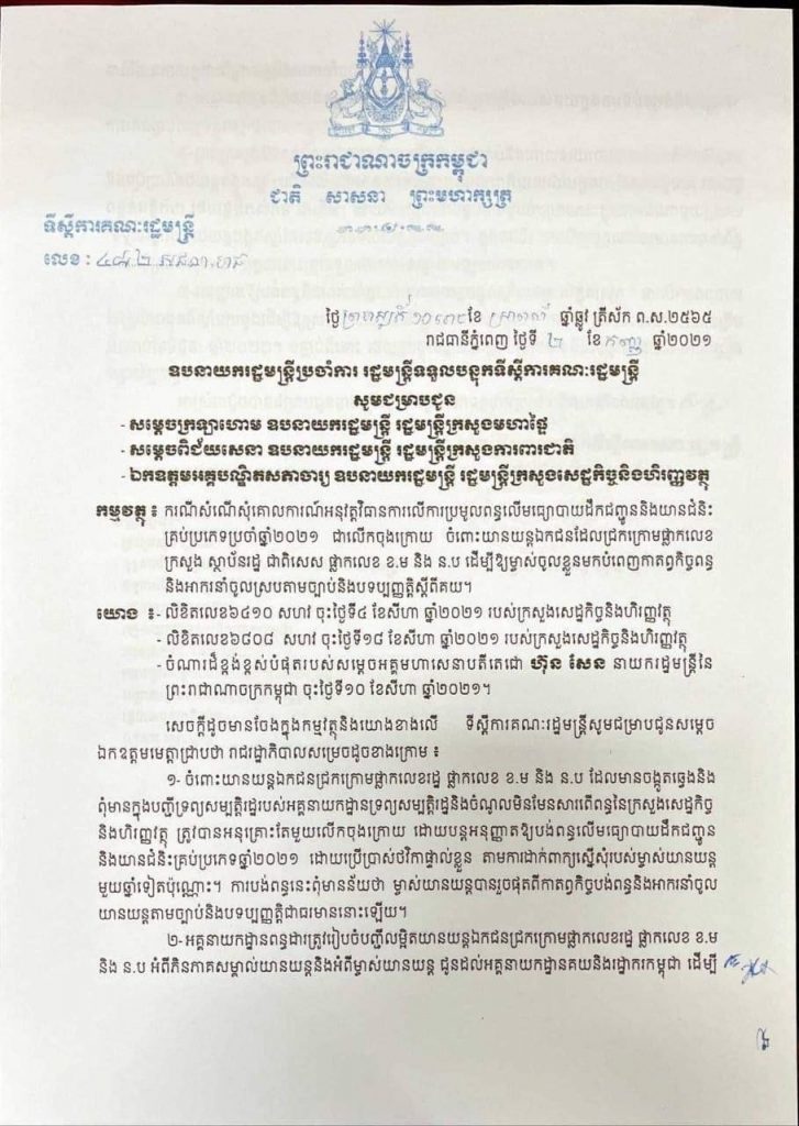 រាជរដ្ឋាភិបាលកម្ពុជា កាលពីថ្ងៃទី២ កញ្ញាម្សិលមិញ បានសម្រេចសេចក្តីជូនដំណឹងទៅរដ្ឋមន្រ្តីក្រសួងមហាផ្ទៃ ក្រសួងការពារជាតិ និងក្រសួងសេដ្ឋកិច្ច និងហិរញ្ញវត្ថុ ដើម្បីអនុវត្តវិធានការលើការប្រមូលពន្ធលើមធ្យោបាយដឹកជញ្ជួន និងយានជំនិះគ្រប់ប្រភេទប្រចាំឆ្នាំ២០២១ជាចុងក្រោយ ចំពោះយានយន្តឯកជនដែលជ្រកក្រោមផ្លាកលេខក្រសួង ស្ថាប័ន ជាពិសេស ផ្លាកលេខ ខ.ម និង ន.គ ដើម្បីឲ្យម្ចាស់ខ្លួនមកបំពេញកាតពន្វកិច្ចពន្ធ និងអាករនាំចូលស្របតាមច្បាប់ និងបទបញ្ញត្តិស្តីពីគយ។