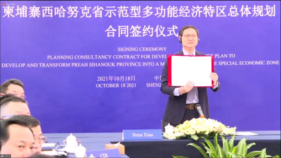 ក្រសួងសេដ្ឋកិច្ច និងហិរញ្ញវត្ថុ និងវិទ្យាស្ថាននគរូបនីយកម្ម និងឌីសាញស៊ិនជិន (UPDIS) របស់ចិន នៅថ្ងៃទី១៨ ខែតុលា ឆ្នាំ២០២១នេះ បានចុះហត្ថលេខាលើកិច្ចសន្យាសេវាកម្មរៀបចំផែនការមេ ដើម្បីអភិវឌ្ឍ និងប្រែក្លាយខេត្តព្រះសីហនុទៅជាតំបន់សេដ្ឋកិច្ចពិសេសគំរូពហុបំណង  ស្របតាមគោលនយោបាយអភិវឌ្ឍន៍វិស័យឧស្សាហកម្មកម្ពុជា (IDP) ឆ្នាំ ២០១៥-២០២៥។