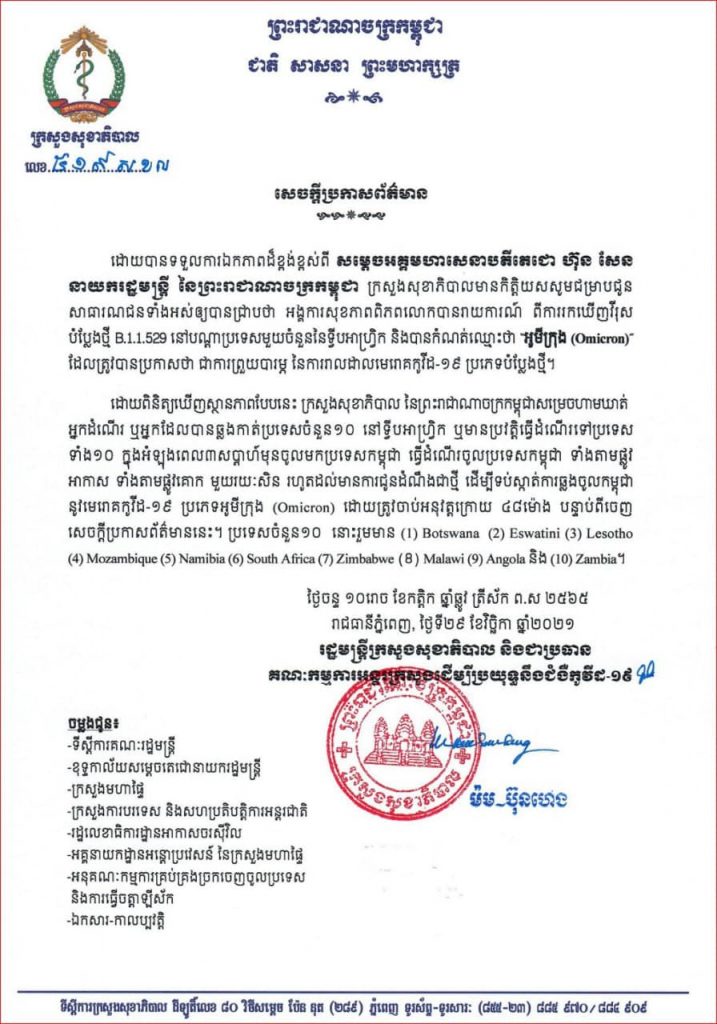 ក្រសួងសុខាភិបាលកម្ពុជា នៅយប់ថ្ងៃទី២៩ វិច្ឆិកានេះ បានចេញសេចក្តីប្រកាសហាមឃាត់អ្នកដំណើរពីប្រទេសចំនួន ១០ នៅទ្វីបអាហ្រ្វិក ឬមានប្រវត្តិធ្វើដំណើរទៅកាន់ប្រទេសទាំង១០ នៅក្នុងពេល ៣សប្តាហ៍មុនចូលមកប្រទេសកម្ពុជា ខណៈអង្គការសុខភាពពិភពលោកបានរាយការណ៍ពីការរកឃើញវីរុសបំប្លែងថ្មី B.1.1.529 ដែលកំណត់ឈ្មោះថា អូមីក្រុង (Omicron) កាលពីពេលថ្មីៗនេះ។
