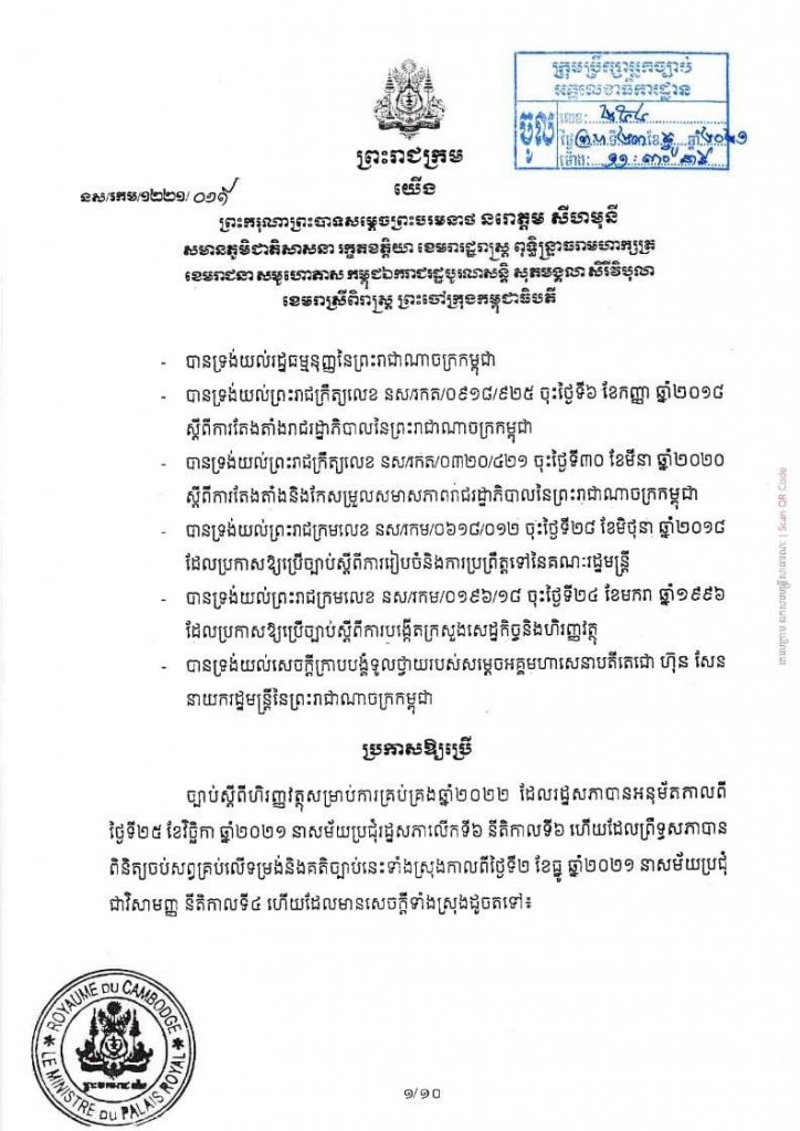 ព្រះមហាក្សត្របានចេញព្រះរាជក្រមប្រកាសឱ្យប្រើច្បាប់ស្តីពីហិរញ្ញវត្ថុសម្រាប់ការគ្រប់គ្រងឆ្នាំ២០២២ ដែលរដ្ឋសភាបានអនុម័តកាលពីថ្ងៃទី២៥ ខែវិច្ឆិកា ឆ្នាំ២០២១ ហើយដែលព្រឹទ្ធសភាបានពិនិត្យចប់សព្វគ្រប់លើទម្រង់និងគតិច្បាប់នេះទាំងស្រុងកាលពីថ្ងៃទី២ ខែធ្នូ ឆ្នាំ២០២១។