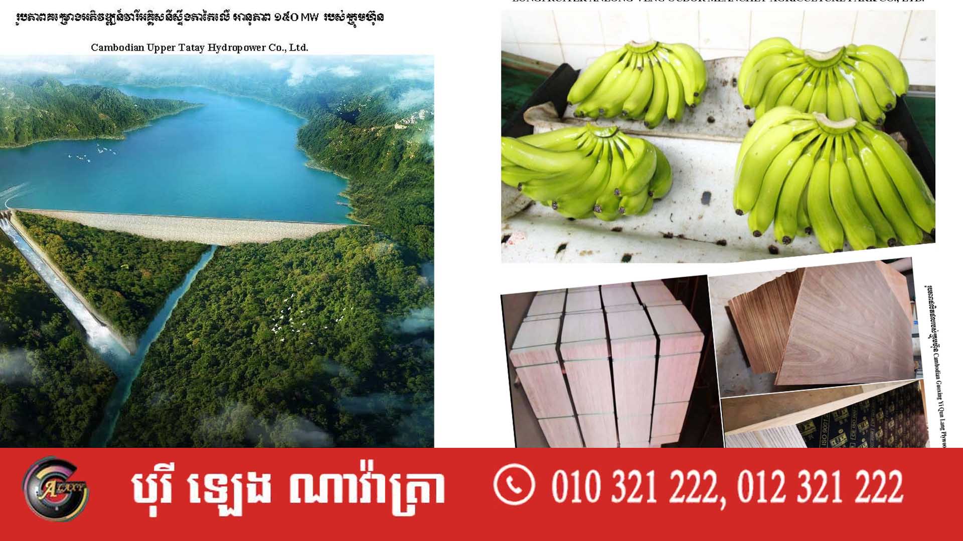 ៩- CAMBODIAN UPPER TATAY HYDROPOWER CO., LTD: គម្រោងវិនិយោគអភិវឌ្ឍន៍វារីអគ្គិសនីស្ទឹងតាតៃលើ អានុភាព ១៥០ MW ដែលមានទីតាំងវិនិយោគស្ថិតនៅស្រុកថ្មបាំង និងស្រុកកោះកុង ខេត្តកោះកុង មានទុនវិនិយោគប្រមាណ ៣៨៩ លានដុល្លារអាមេរិក និងអាចបង្កើតការងារបានចំនួន ១៥៨០កន្លែង។