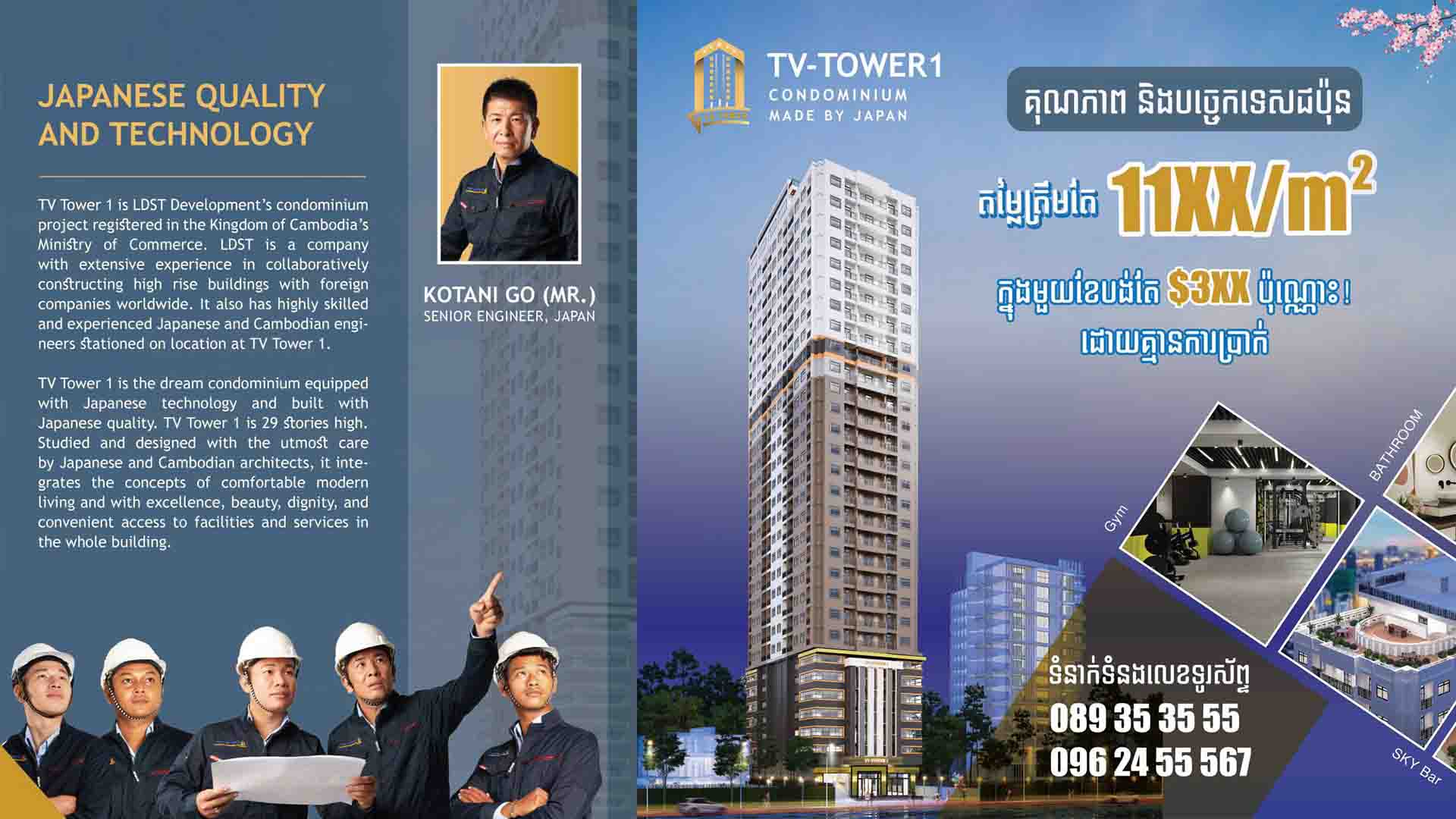 បន្ថែមពីលើគុណតម្លៃស្នូលទាំង ៥ នៃគម្រោងខុនដូ TV-Tower 1 នេះដែរ លោក Kotani Go វិស្វករជាន់ខ្ពស់ប្រចាំក្រុមហ៊ុន LDST Development (Cambodia) Co., Ltd បានលើកឡើងថា៖ “សម្រាប់គម្រោងខុនដូ TV-Tower 1 នេះ ក្រុមវិស្វករ និងស្ថាបត្យករជប៉ុនយើងខ្ញុំ ដែលធ្លាប់មានបទពិសោធន៍សាងសង់អគារខ្ពស់ៗនៅប្រទេសជប៉ុន និងនៅតាមបណ្ដាប្រទេសនានា នៅជុំវិញពិភពលោក បានអភិវឌ្ឍន៍សាងសង់ឡើង យ៉ាងយកចិត្តទុកដាក់ និងម៉ត់ចត់ជាទីបំផុត ដើម្បីសម្រេចបាននូវគម្រោងខុនដូមួយ ប្រកបដោយគុណភាពស្តង់ដា និងគុណភាពជប៉ុនពិត ១០០% ជូនដល់អតិថិជន”។