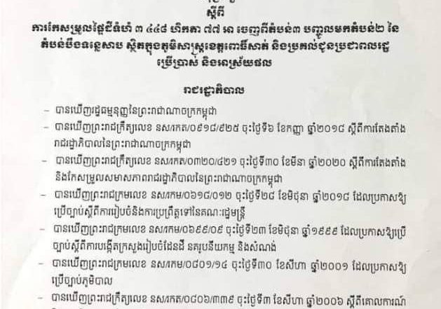 រាជរដ្ឋាភិបាលកម្ពុជា បានចេញអនុក្រឹត្យកែសម្រួលផ្ទៃដីទំហំ ៣៤៤៨ហិកតា ៧៧អា ចេញពីតំបន់៣ បញ្ចូលមកតំបន់២ នៃតំបន់បឹងទន្លេសាប ស្ថិតក្នុងភូមិសាស្ដ្រខេត្តពោធិ៍សាត់ និងប្រគល់ជូនប្រជាពលរដ្ឋប្រើប្រាស់ និងអាស្រ័យផល។