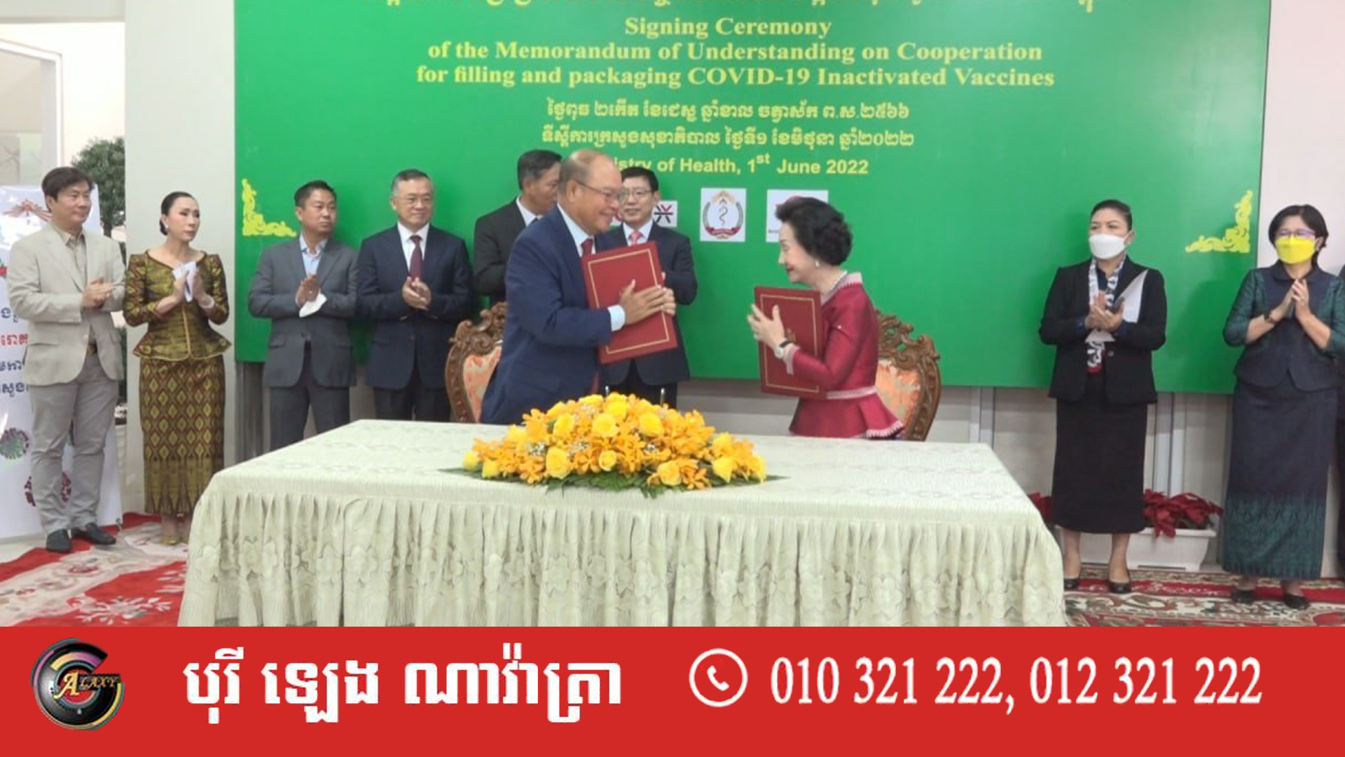ពិធីចុះហត្ថលេខាលើអនុស្សរណៈនៃការយោគយល់គ្នា ស្តីពីកិច្ចសហប្រតិបតិ្តការវេចខ្ចប់វ៉ាក់សាំងបង្ការវីរុស កូវីដ-១៩ រវាងសហគ្រាសឱសថកម្ពុជា និងក្រុមហ៊ុន Sinovac Life Sciences នៃសាធារណរដ្ឋប្រជាមានិតចិន នៅថ្ងៃទី០១ ខែមិថុនា ឆ្នាំ២០២២ នៅទីស្តីការក្រសួងសុខាភិបាលកម្ពុជា ក្រោមអធិបតីភាពលោក ម៉ម ប៊ុនហេង រដ្ឋមន្រី្តក្រសួងសុខាភិបាល ជាមួយលោក Wang Wentian (វ៉ាង វិនធាន) ឯកអគ្គរដ្ឋទូតចិនប្រចាំកម្ពុជា អ្នកឧកញ៉ា ជឹង សុភាព អគ្គនាយិកាសហគ្រាសឱសថកម្ពុជា លោក Gao Qiang (កៅ ជាំង) អ្នកគ្រប់គ្រងទូទៅ របស់ក្រុមហ៊ុន Sinovac Life Sciences Co.,Ltd។