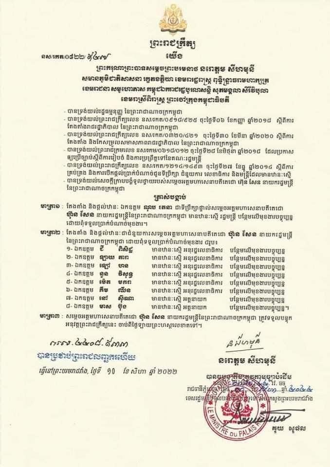ព្រះរាជក្រឹត្យលេខ នស/រកត/០៨២២/៩២៧ នេះដដែល ក៏បានតែងតាំង និងផ្តល់ឋានៈ មន្ត្រីជាន់ខ្ពស់ចំនួន ៨ រូបផ្សេងទៀត ជាជំនួយការសម្តេចតេជោ ហ៊ុន សែន មានឋានៈស្មើ អនុរដ្ឋលេខាធិការ និងឋានៈស្មើ អគ្គនាយក បន្ថែមលើមុខងារបច្ចុប្បន្នផងដែរ។
