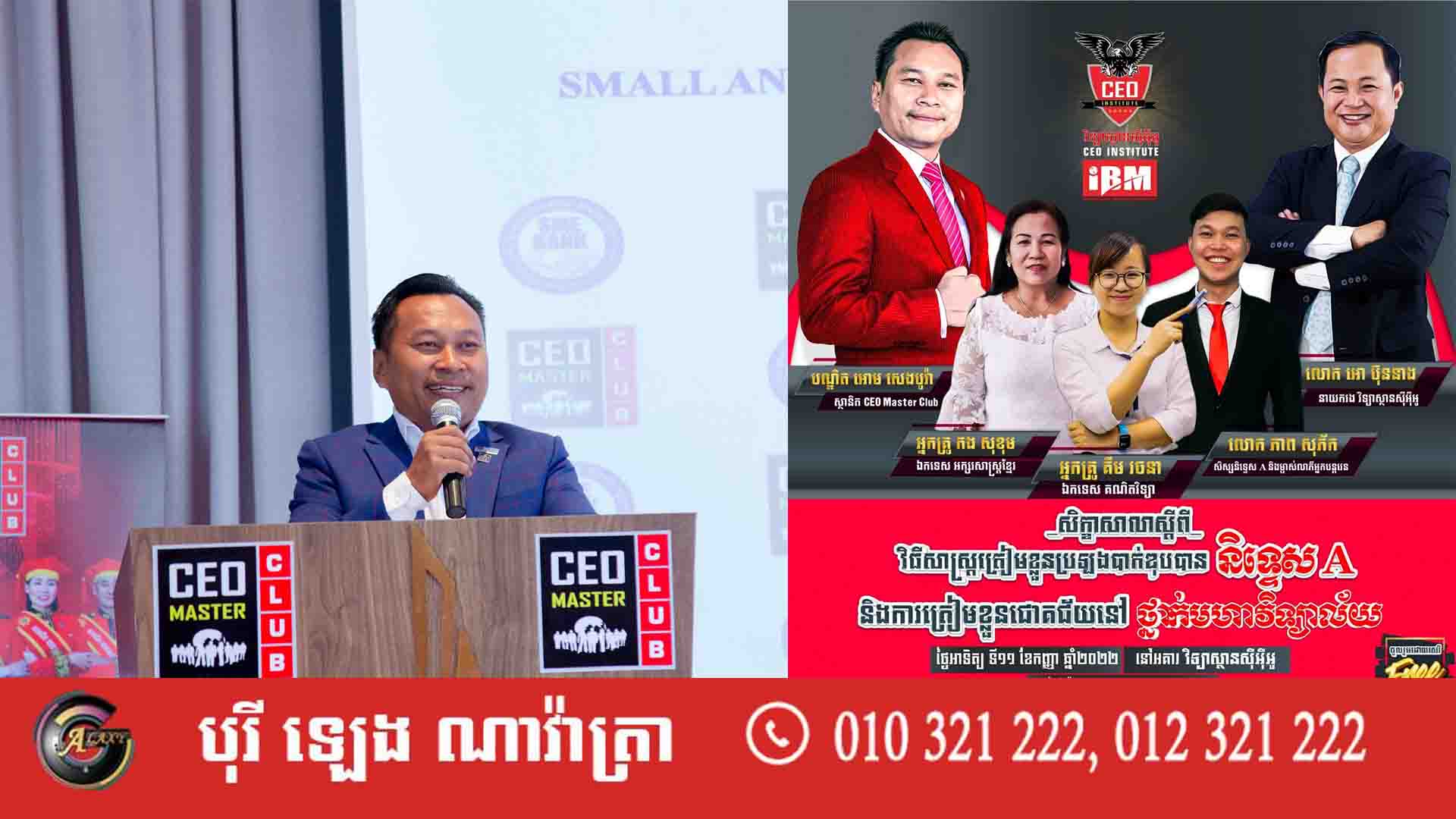 នាថ្ងៃទី១១ ខែកញ្ញា ខាងមុខនេះ លោកបណ្ឌិត អោម សេងបូរ៉ា ស្ថាបនិកវិទ្យាស្ថាន CEO Master Club នឹងរៀបចំសិក្ខាសាលាមួយស្ដីពី វិធីសាស្រ្តត្រៀមខ្លួនប្រឡងបាក់ឌុបបាននិទ្ទេសA និងការត្រៀមខ្លួនជោគជ័យនៅថ្នាក់មហាវិទ្យាល័យជូនសិស្សិ និស្សិត ដែលមានបំណងចូលរួម។