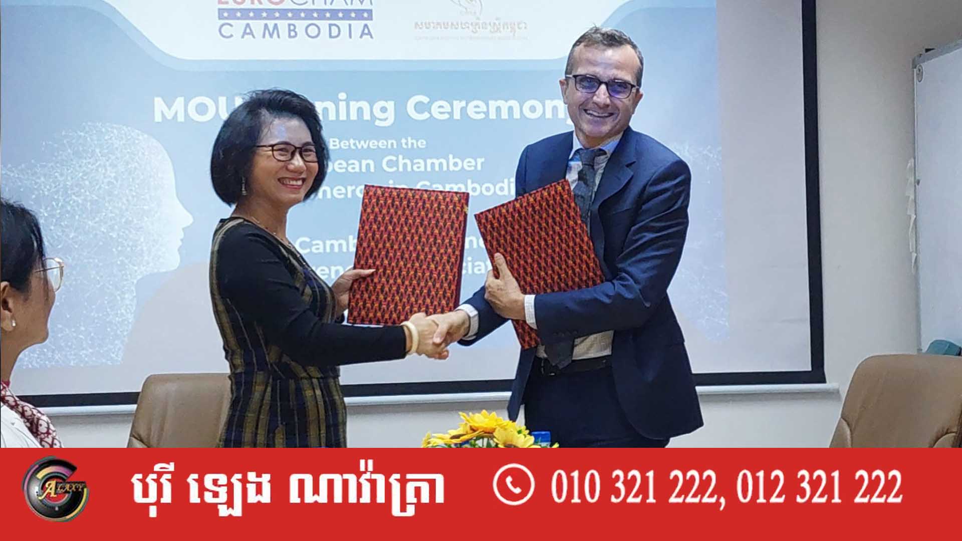 សមាគមសហគ្រិនស្ត្រី-កម្ពុជា ហៅកាត់ CWEA និងសភាពាណិជ្ជកម្មអឺរ៉ុបនៅកម្ពុជា ហៅកាត់ EUROCHAM បានចុះអនុស្សរណៈយោគយល់គ្នា នៅព្រឹកថ្ងៃចន្ទ ទី២២ សីហានេះ ដើម្បីពង្រឹងទំនាក់ទំនងឲ្យកាន់តែស៊ីជម្រៅរឹងមាំបន្ថែមទៀត ដើម្បីជំរុញវិនិយោគិន ផលិតផល និងពាណិជ្ជកម្មទ្វេភាគី។