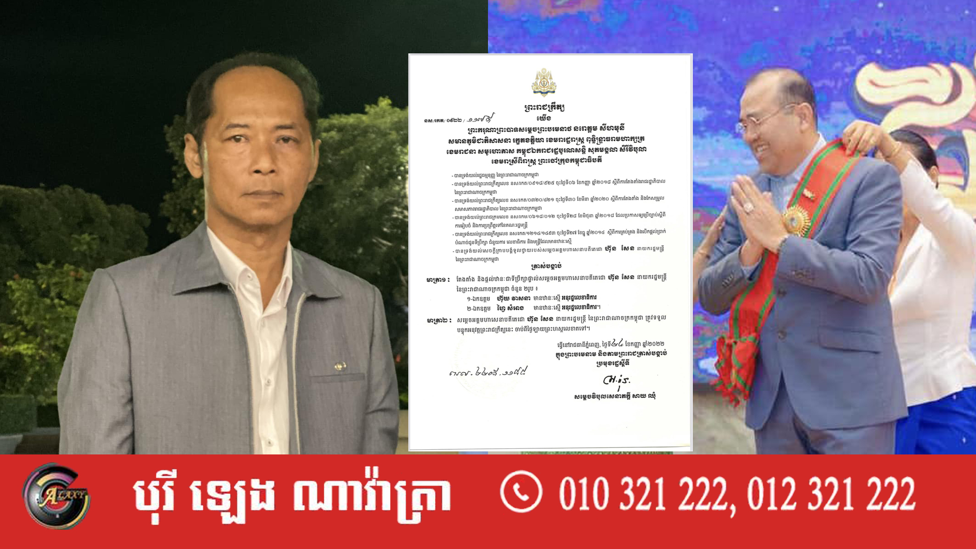 កាលពីថ្ងៃទី២៤ ខែកញ្ញា ឆ្នាំ២០២២ សម្តេចវិបុលសេនាភក្តី សាយ ឈុំ ប្រមុខរដ្ឋស្តីទី ​​បាន​ចេញ​ព្រះរាជក្រឹត្យ តែងតាំង​​អ្នក​ដឹកនាំ​រឿង​២​រូប ជា​​ទីប្រឹក្សា​ផ្ទាល់​សម្តេច​តេជោ ហ៊ុន សែន នាយករដ្ឋមន្ត្រី​នៃ​ព្រះរាជាណាចក្រកម្ពុជា។