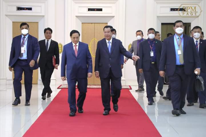 នាយករដ្ឋមន្ត្រីកម្ពុជា សម្តេចតេជោ ហ៊ុន សែន និងនាយករដ្ឋមន្ត្រីវៀតណាម លោកផាម មិញជិញ ជួបពិភាក្សាការងារនៅវិមានសន្តិភាព នាព្រឹកអង្គារ ទី៨ វិច្ឆិកា ឆ្នាំ២០២២។
