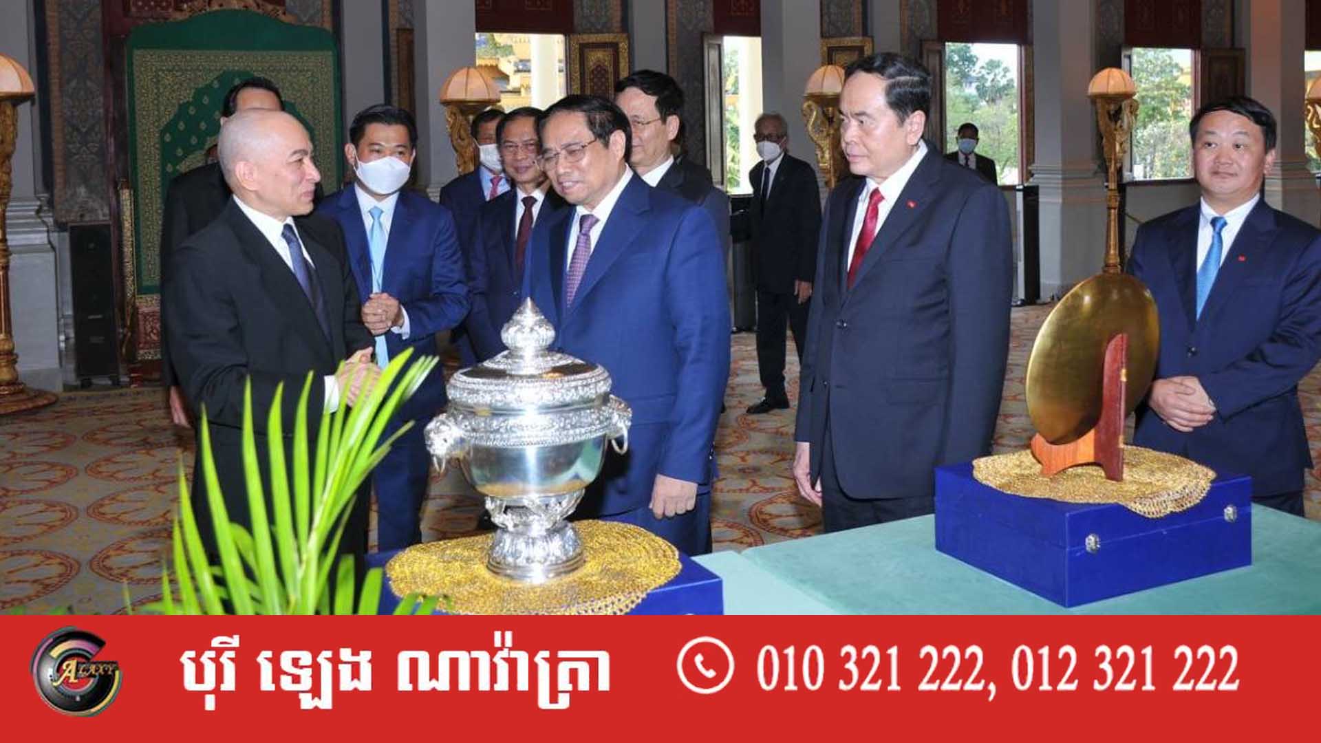 ព្រះករុណា ព្រះបាទសម្តេចព្រះបរមនាថ នរោត្តម សីហមុនី ព្រះមហាក្សត្រនៃកម្ពុជា និងសម្តេចព្រះមហាក្សត្រី នរោត្តម មុនិនាថ សីហនុ ព្រះវររាជមាតាជាតិខ្មែរ ក្នុងសេរីភាព សេចក្តីថ្លៃថ្នូរ និងសុភមង្គល ស្តេចសព្វព្រះរាជហឫទ័យ ព្រះបរមរាជានុញ្ញាតជូន លោក ផាម មិញជិញ នាយករដ្ឋមន្រ្តីវៀតណាម និងគណៈប្រតិភូ ចូលថ្វាយបង្គំគាល់ នារសៀលថ្ងៃទី០៨ ខែវិច្ឆិកា ឆ្នាំ២០២២ នៅព្រះបរមរាជវាំង។