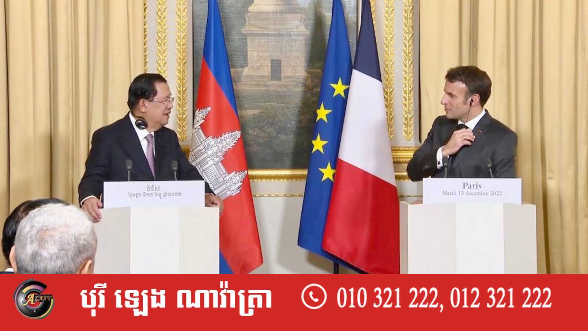 ការថ្លែងរបស់សម្តេចតេជោ ហ៊ុន សែន ធ្វើការនៅក្នុងសន្និសីទព័ត៌មានរួមគ្នានៅវិមានអេលីហ្សេ នាទីក្រុងបារីស កាលពីថ្ងៃទី១៣ ខែធ្នូ ឆ្នាំ២០២២ រវាងមេដឹកនាំនៃប្រទេសទាំងពីរ។