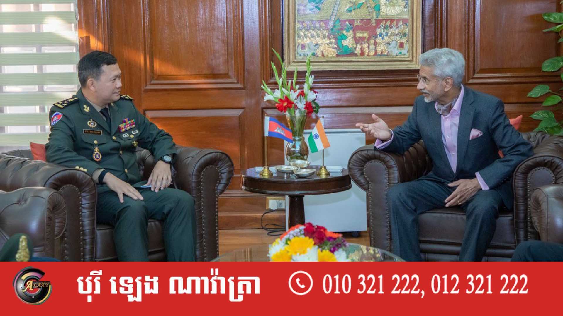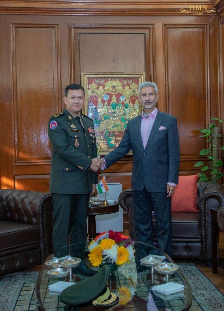ឧត្តមសេនីយ៍ឯក ហ៊ុន ម៉ាណែត អគ្គមេបញ្ជាការរង នៃកងយោធពលខេមរភូមិន្ទ មេបញ្ជាការកងទ័ពជើងគោក កាលពីថ្ងៃទី០៣ ខែកុម្ភៈ ឆ្នាំ២០២៣ ជួបសម្តែងការគួរសម ជាមួយនឹងលោក ស៊ុប្រាម៉ានៀម ជែស្យាងការ រដ្ឋមន្ត្រីការបរទេសឥណ្ឌា ខណៈដែលលោកឧត្តមសេនីយ៍កំពុងដឹកនាំគណៈប្រតិភូជាន់ខ្ពស់កងទ័ពជើងគោកនៃកងយោធពលខេមរភូមិន្ទក្នុងដំណើរបំពេញទស្សនកិច្ចផ្លូវការនៅរដ្ឋធានីញ៉ូដេលី សាធារណរដ្ឋឥណ្ឌា។