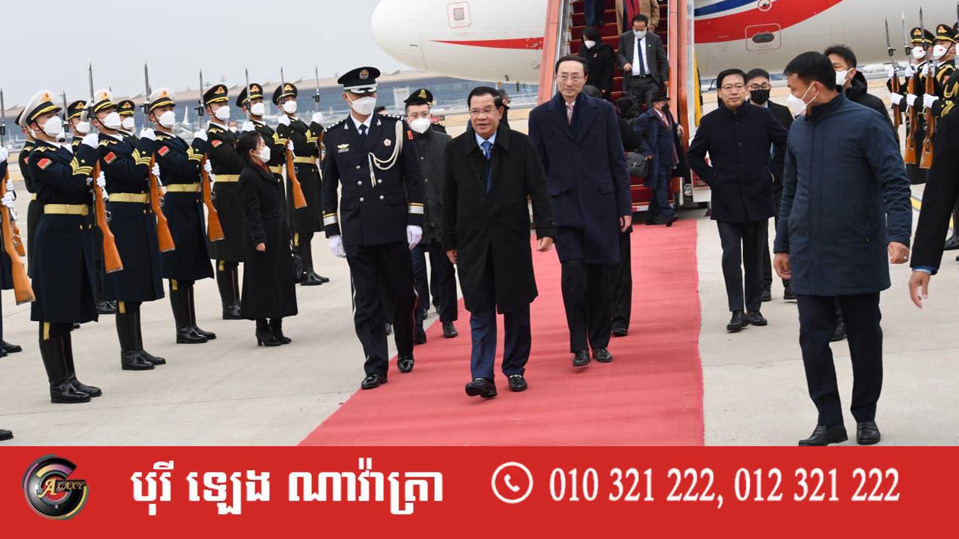 សម្តេចតេជោ ហ៊ុន សែន នាយករដ្ឋមន្ត្រី បានដឹកនាំគណៈប្រតិភូជាន់ខ្ពស់របស់រាជរដ្ឋាភិបាល ទៅដល់រដ្ឋធានីប៉េកាំង ប្រទេសចិន នៅម៉ោងប្រមាណ ១២៖២០នាទី នាថ្ងៃព្រហស្បតិ៍ ទី៩ ខែកុម្ភៈ ដោយភាគីចិន ក្រាលព្រំក្រហមទទួលស្វាគមន៍ជាមួយនឹងបាច់ផ្កាក្រហមដ៏ស្រស់ស្អាត និងបដិសណ្ឋារកិច្ចយ៉ាងខ្ពង់ខ្ពស់ពីសំណាក់ថ្នាក់ដឹកនាំជាន់ខ្ពស់របស់ចិន ស្ថិតនៅអាកាសយានដ្ឋានក្នុងក្រុងប៉េកាំង។