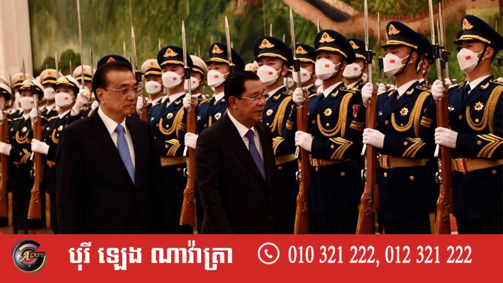 ពិធីបដិសណ្ឋារកិច្ចផ្លូវការរបស់ សម្តេចតេជោនាយករដ្ឋមន្រ្តី ត្រូវបានធ្វើឡើងនៅវេលារសៀលថ្ងៃទី១០ ខែកុម្ភៈនេះ នៅក្នុងសាលនៃមហាវិមានប្រជាជនចិន ក្នុងរដ្ឋធានីប៉េកាំង ក្រោមវត្តមាននៃការធ្វើគារវកិច្ចវស្វាគមន៍យ៉ាងកក់ក្តៅបំផុត ពីសមភាគីចិន លោក លី ខឺឈាង នាយករដ្ឋមន្រ្តី នៃសាធារណរដ្ឋប្រជាមានិតចិន។