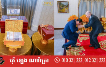 សម្ដេចធិបតី ចូលក្រាបថ្វាយបង្គំគាល់ និងថ្វាយក្រដាស់ប្រាក់ប្រភេទ២សែនរៀលថ្មី ដល់ព្រះមហាក្សត្រ