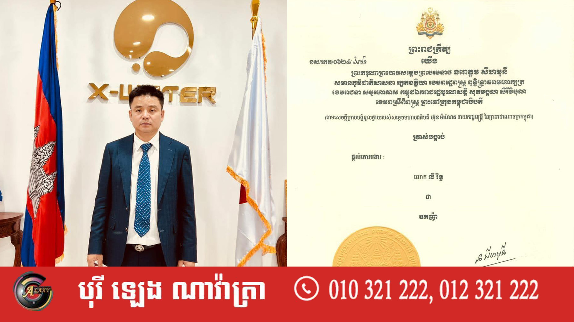 ព្រះមហាក្សត្រ ត្រាស់បង្គាប់ផ្តល់គោរមងារ «ឧកញ៉ា» ជូនលោក លី រិទ្ធ អគ្គនាយកក្រុមហ៊ុន X-Water Technology