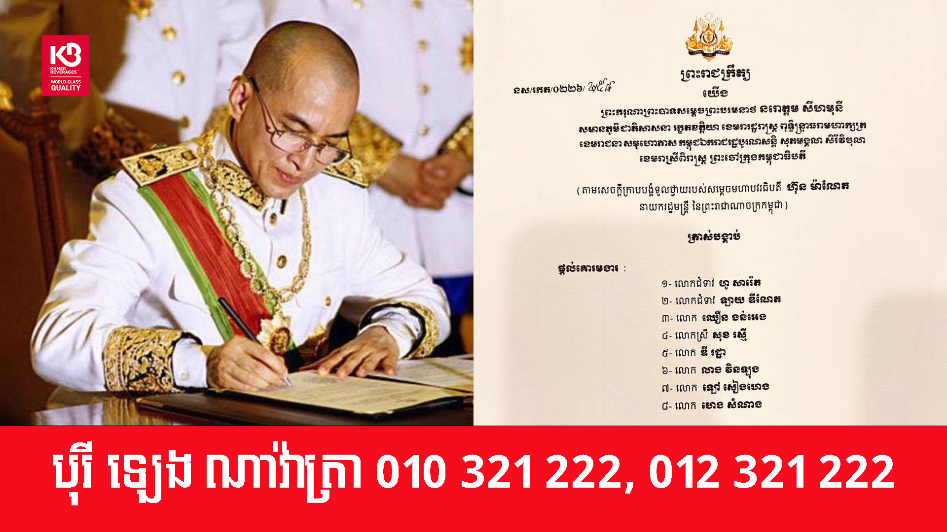 • ព្រះមហាក្សត្រ ចេញព្រះរាជក្រឹត្យផ្តល់គោរមងារដល់អ្នកជំនួញ ៨រូប ជា «ឧកញ៉ា» ក្នុងថ្ងៃតែមួយ