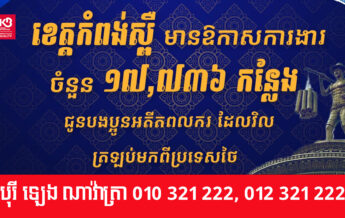 នៅដើមខែវិច្ឆិកានេះ! ឱកាសការងារ ជិត២ម៉ឺនកន្លែងនៅខេត្ដកំពង់ស្ពឺ កំពុងបើកទ្វារងចាំទទួលបងប្អូនអតីតពលករ ដែលវិលត្រឡប់មកពីប្រទេសថៃដាក់ពាក្យធ្វើការ