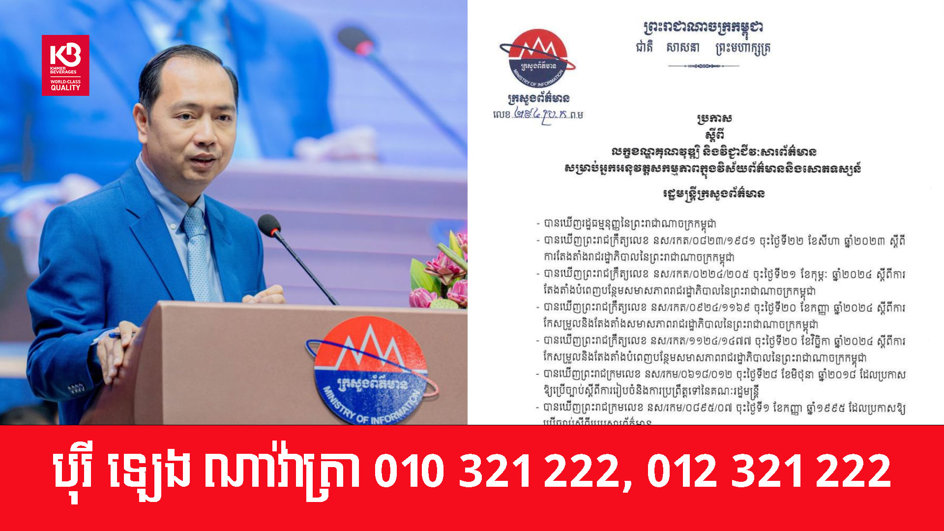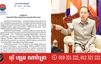ក្រសួងព័ត៌មានជូនដំណឹងដល់ លោកអ្នកឧកញ៉ា អ្នកឧកញ៉ា ឧកញ៉ាៗម្ចាស់ស្ថានីយទូរទស្សន៍ទាំងអស់ ឱ្យបញ្ឈប់ការចាក់ផ្សាយខ្សែភាពយន្តថៃគ្រប់ប្រភេទ