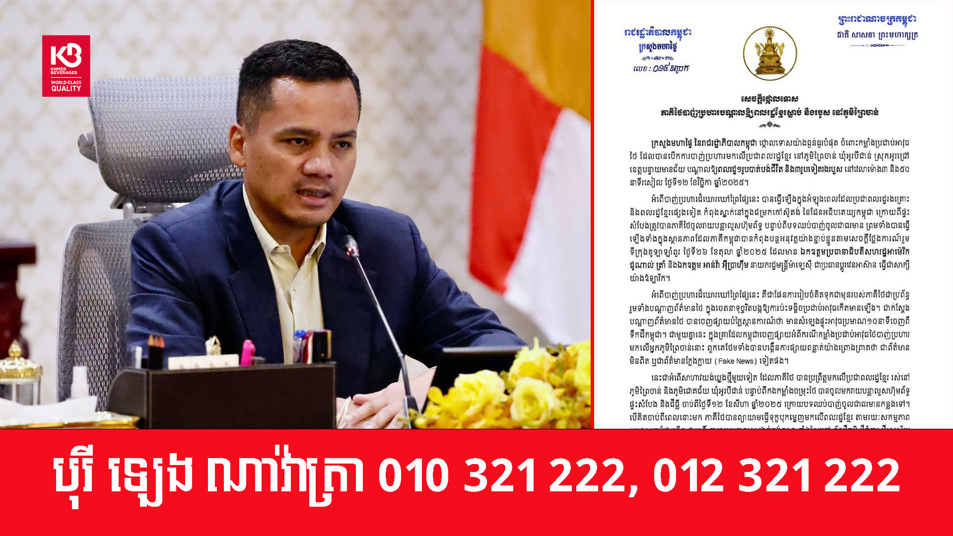 ក្រសួងមហាផ្ទៃ ប្រកាសគាំទ្រពេញទំហឹងចំពោះគោលជំហររបស់រាជរដ្ឋាភិបាលក្នុងការប្រើប្រាស់សិទ្ធិស្របច្បាប់ការពារខ្លួនក្នុងដែនអធិបតេយ្យ និងបូរណភាពទឹកដីប្រឆាំងនឹងការឈ្លានពានពីសំណាក់កងទ័ពថៃ