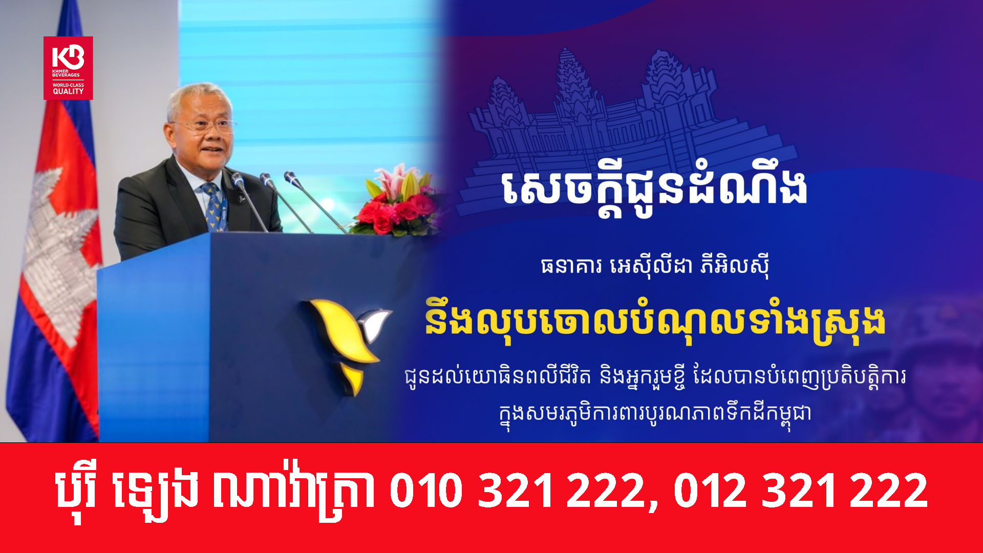 ធនាគារ អេស៊ីលីដា សម្រេចលុបចោលបំណុលទាំងស្រុង ជូនដល់យោធិនពលីជីវិត និងអ្នករួមខ្ចី ដែលបំពេញប្រតិបត្តិការក្នុងសមរភូមិការពារបូរណភាពទឹកដីកម្ពុជា