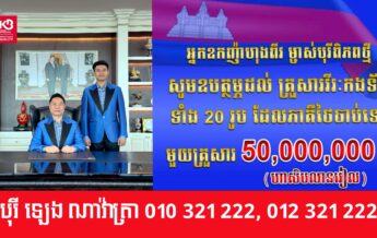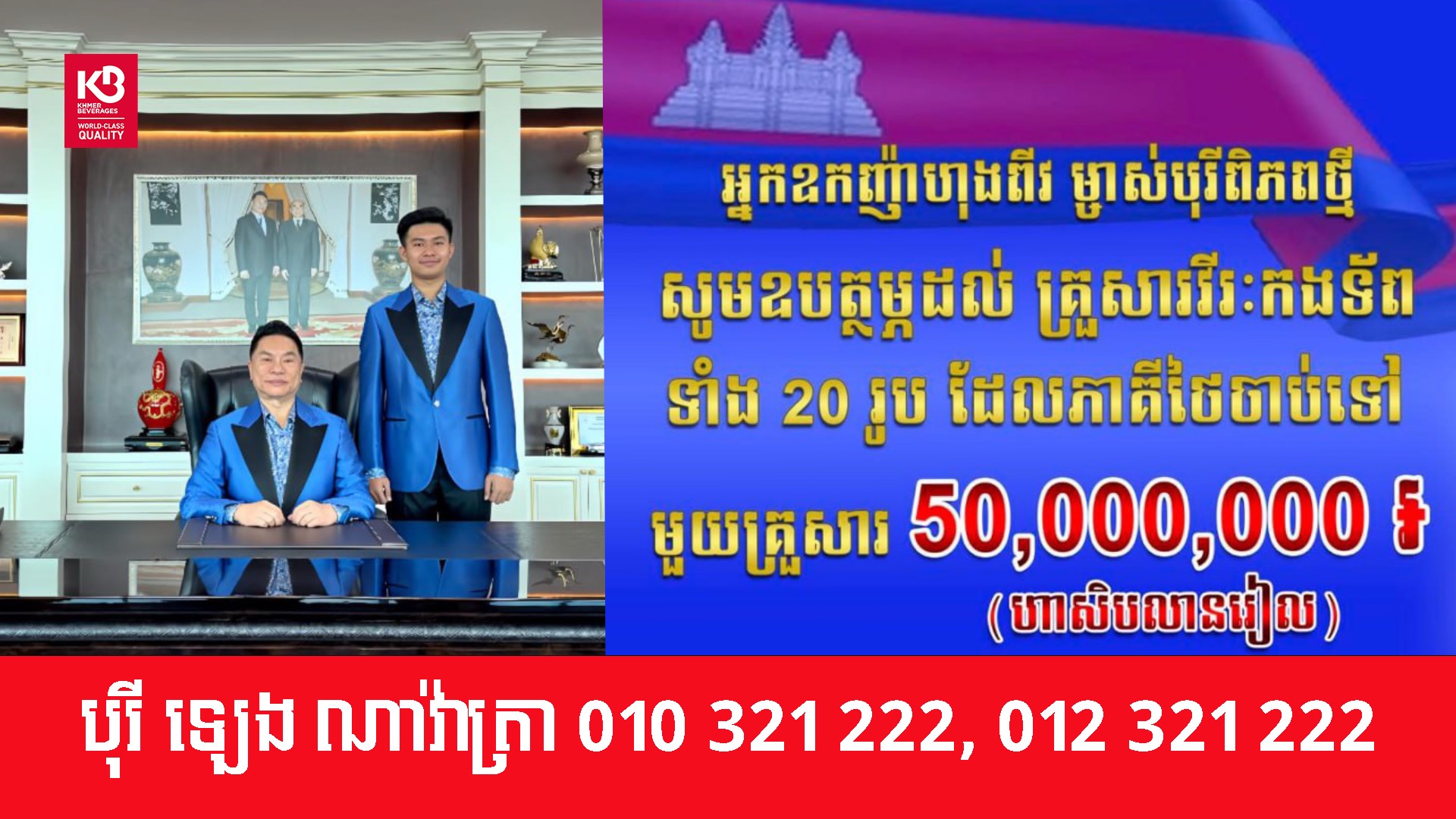 អ្នកឧកញ៉ា ហុង ពីវ ប្រកាសឧបត្ថម្ភថវិកា ៥០លានរៀល ក្នុងមួយគ្រួសារ ដល់កងទ័ពកម្ពុជា ២០រូប ដែលថៃចាប់ខ្លួន