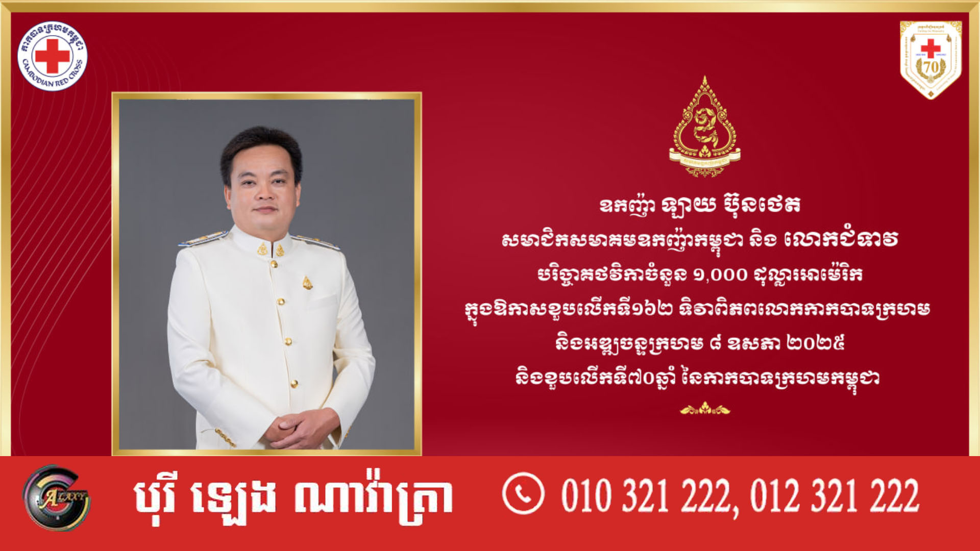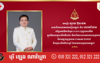 ឧកញ៉ា ឡាយ ប៊ុនថេត និងលោកជំទាវ បរិច្ចាគថវិកាចំនួន ១,០០០ ដុល្លារអាម៉េរិក ក្នុងឱកាសខួបទី១៦២ ទិវាពិភពលោកកាកបាទក្រហម និងអឌ្ឍចន្ទក្រហម ៨ ឧសភា ឆ្នាំ២០២៥