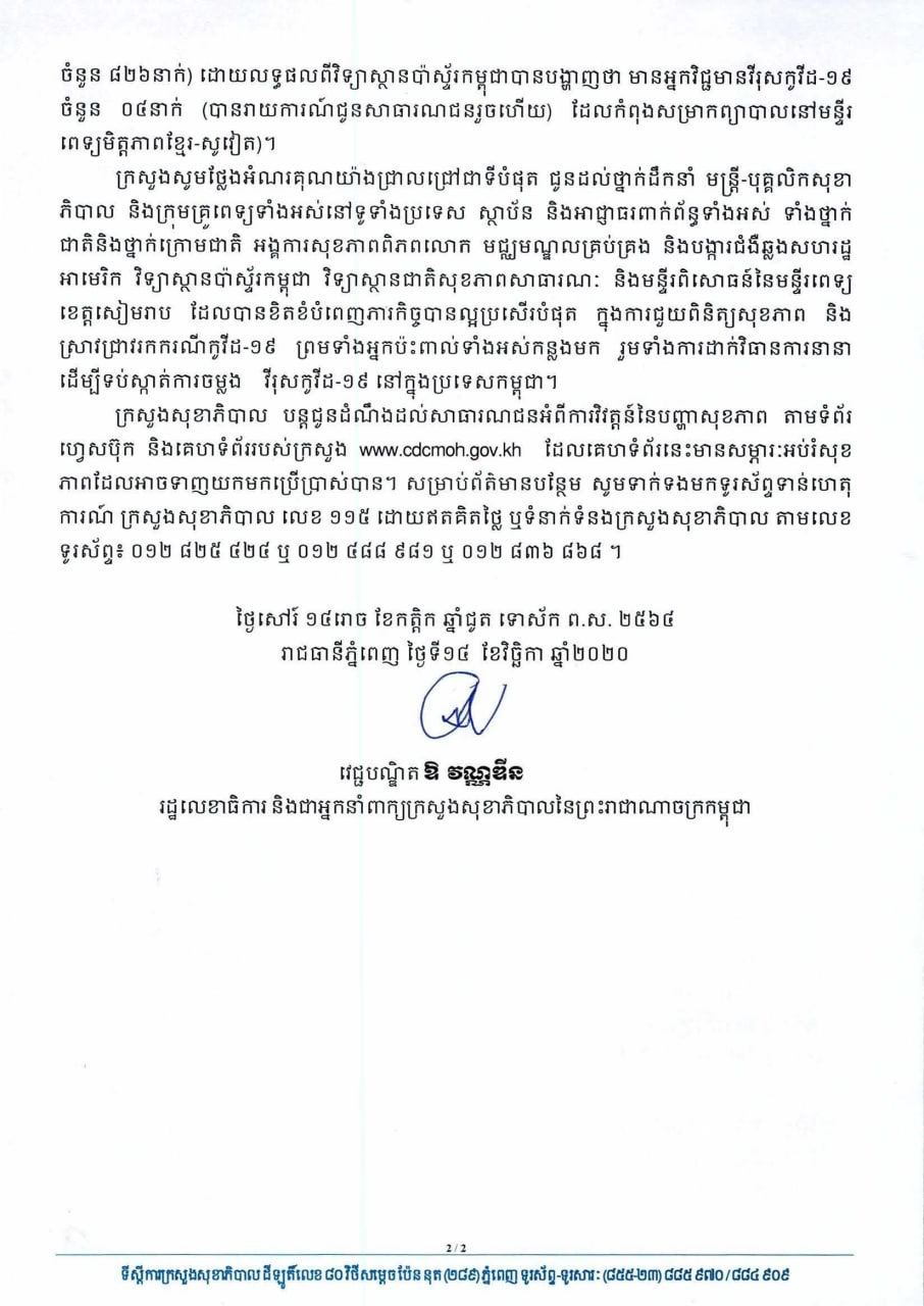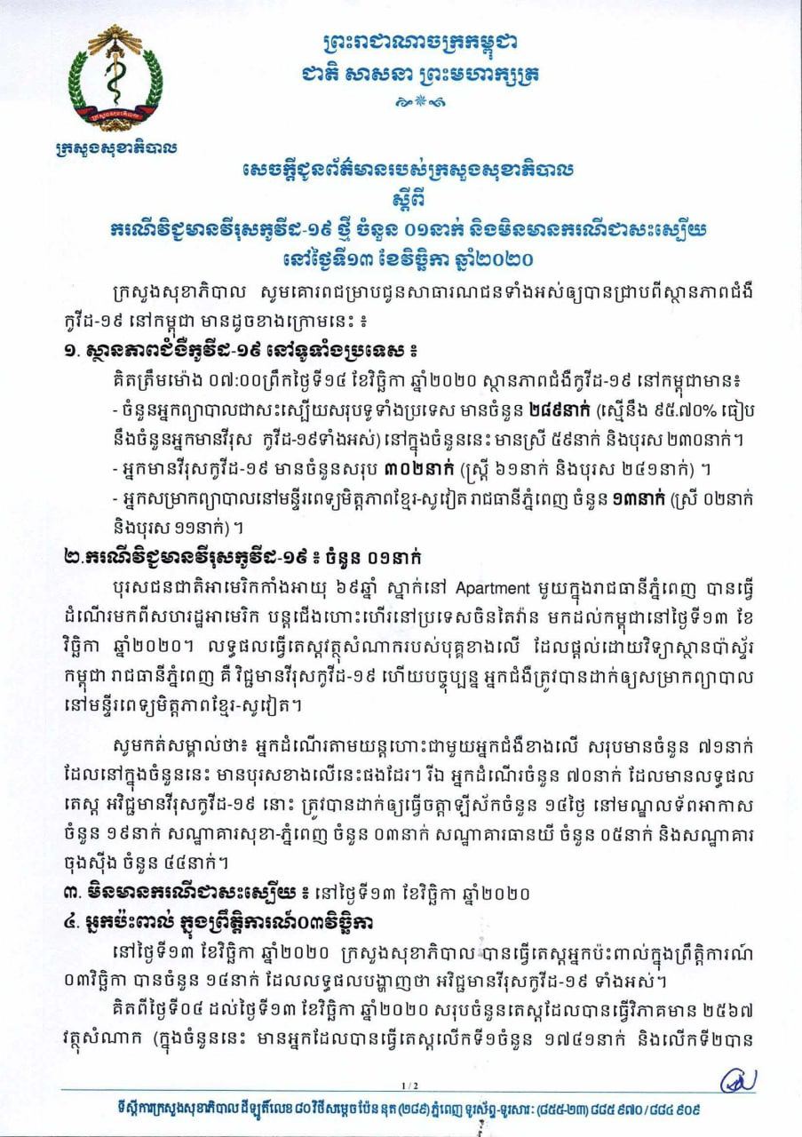 ក្រសួងសុខាភិបាល បានប្រកាសព័ត៌មានថា ថ្ងៃទី១៤ ខែវិច្ឆិកា ឆ្នាំ២០២០នេះ ករណីវិជ្ជមានវីរុសកូវីដ១៩ ១នាក់ លើបុរសជនជាតិអាមេរិក អាយុ ៦៩ឆ្នាំ ស្នាក់នៅរាជធានីភ្នំពេញ បានធ្វើដំណើរមកពីសហរដ្ឋអាមរិក ហើយបន្តជើងយន្តហោះនៅប្រទេសចិនតៃវ៉ាន់ មកដល់កម្ពុជានៅថ្ងៃទី១៣ ខែវិច្ឆិកា ឆ្នាំ២០២០។ ហើយនៅថ្ងៃទី១៣ ខែវិច្ឆិកា ឆ្នាំ២០២០ មិនមានអ្នកជាសះស្បោយទេ។